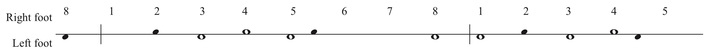 We show the rhythm of the stamps in the context of the eight-beat unit here. A black dot means a loud stamp, and a white one, a soft stamp: