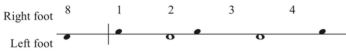 The rhythm of the stamps in the context of the eight-beat unit is shown here. A black dot means a loud stamp, and a white one, a soft stamp: