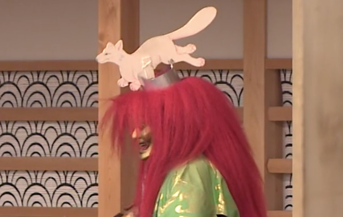 The sculptural features of a mask differ from item to item. The one used in the performance filmed for this project is essentially the same as the standard Kotobide, except that its surface is painted gold instead of red. However, other Dei-kotobide are closer to the larger Ōtobide, which is used for the rain and thunder deity Wake-ikazuchi in Kamo, or for performance variants of Kokaji.